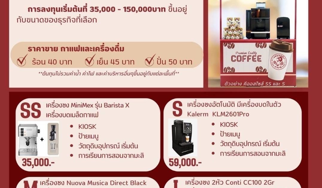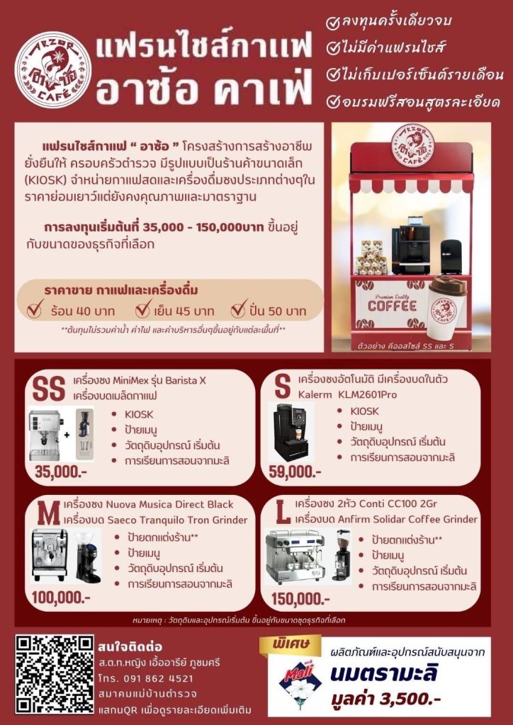 กาแฟ “อาซ้อ” 5 มกราคม 2567 โดย admin_karaket / ข่าวประชาสัมพันธ์,ข่าวกิจกรรม,ข่าวประชาสัมพันธ์,ข่าวประชาสัมพันธ์,ข่าวฝากประชาสัมพันธ์ สมาคมแม่บ้านตำรวจจัดทำแฟรนไชส์กาแฟ “อาซ้อ” มีรูปแบบเป็นร้านค้าขนาดเล็ก หรือ คีออส (KIOSK) จำหน่ายกาแฟสดและเครื่องดื่มชงประเภทต่างๆ ในราคาย่อมเยา แต่ยังคงคุณภาพและมาตรฐาน โดยช่วงแรกสมาคมแม่บ้านตำรวจจะสนับสนุนตู้คีออส (Kiosk) ให้กับข้าราชการตำรวจและครอบครัวที่มีความประสงค์จะดำเนินธุรกิจแฟรนไซส์กาแฟแต่ขาดแคลนทุนทรัพย์ โดยไม่มีค่าใช้จ่าย ซึ่งจะพิจารณาจากเหตุผลและความจำเป็นรวมไปถึงทำเลที่ตั้งในการขาย และประชาสัมพันธ์ให้ข้าราชการตำรวจและครอบครัวที่มีความสนใจธุรกิจแฟรนไชส์กาแฟ ในราคาสวัสดิการตามขนาดของตู้คืออส (Kiosk)การลงทุนเริ่มต้นที่ 35,000 – 150,000บาท ขึ้นอยู่กับขนาดของธุรกิจที่เลือก โดยต้นทุนวัตถุดิบของกาแฟในแก้วที่มีส่วนผสมเยอะสุด จะอยู่ที่แก้วละ 15 บาทพร้อมทั้งจัดการฝึกอบรมการชงกาแฟขั้นพื้นฐาน และวิธีการบริหารจัดการร้านกาแฟติดต่อรายละเอียดแฟรนไชส์อาซ้อคาเฟ่เพิ่มเติมได้ที่ ส.ต.ท.หญิง เอื้ออารีย์ ภูชมศรี หมายเลข 09 1862 4521 หรือ Email : policewives2567@gmail.com จำนวนคนดู: 3