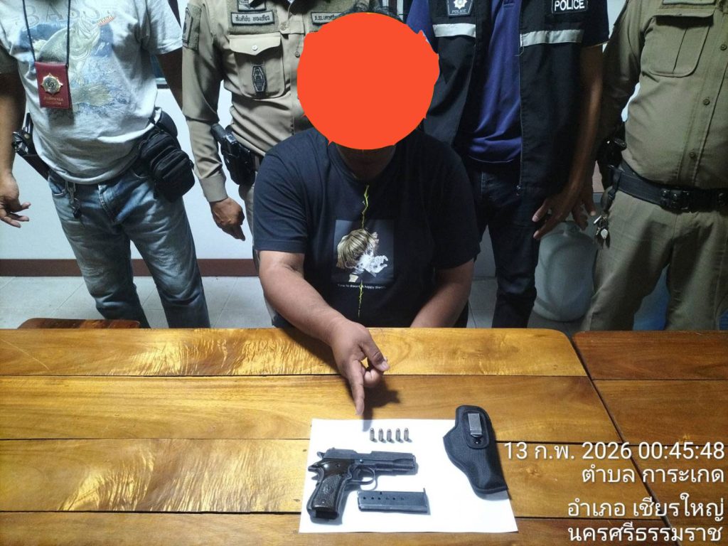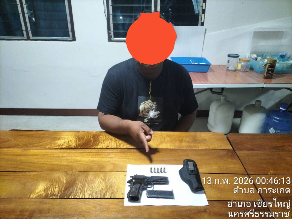 จับกุม ผู้ต้องหา 1 ราย 1 คน 13 กุมภาพันธ์ 2569 โดย admin_karaket / ข่าวประชาสัมพันธ์,ข่าวกิจกรรม,ข่าวประชาสัมพันธ์,ข่าวประชาสัมพันธ์,ข่าวฝากประชาสัมพันธ์ 12 กุมภาพันธ์ 2569 เวลา 23.35 น.ภายใต้การอำนวยการของ พล.ต.ต.พรชัย ขจรกลิ่น รอง ผบช.ภ.8 รรท.ผบก.ภ.จว.นครศรีธรรมราช พ.ต.ท.วรรณชัย คงศาลา สวญ.สภ.การะเกดชุดจับกุมนำโดย พ.ต.ท.สายันต์ ชูกร สวป.สภ.การะเกด/เจ้าพนักงาน ป.ป.ส. เลขประจำตัว 6606620 ว่าที่ พ.ต.ต.ปริญญา แก้วยอด สว.สส.สภ.การะเกด พร้อม ร.ต.อ.สันติชัย ทองเกียว , ร.ต.อ.ศักดิพล สกุณา , ร.ต.ต.ธีรวุฒิ ปล้องเกิด , ด.ต.ประพันธ์ คชฤทธิ์ , ส.ต.ต.เทพดนัย ผิวนิ่มนวลจับกุม ผู้ต้องหา 1 ราย 1 คนพร้อมด้วยของกลาง อาวุธปืนพกสั้นออโตเมติก ขนาด 7.65 มม.เครื่องกระสุนปืน ยี่ห้อ AP ขนาด .๓2 AUTO จำนวน ๕ นัดแม็กกาซีนปืน 1 อัน4.ซองพกในหนังสีดำ จำนวน 1 ซองข้อกล่าวหามีอาวุธปืนและเครื่องกระสุนไว้ในครอบครองโดยไม่ได้รับอนุญาต , พกพาอาวุธปืนเข้าไปในเมือง หมู่บ้านหรือทางสาธารณะโดยไม่ได้รับอนุญาตและไม่มีเหตุอันสมควรสถานที่เหตุ/จับกุม ถนนซอยบ้านนา ม.๘ ตำบลการะเกด อำเภอเชียรใหญ่ จังหวัดนครศรีธรรมราช จำนวนคนดู: 4