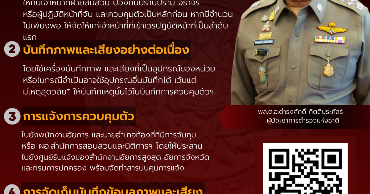 พล.ต.อ.ดำรงศักดิ์ กิตติประภัสร์ ผบ.ตร. กำชับ “แนวทางการปฏิบัติเกี่ยวกับการบันทึกภาพและเสียงในขณะจับและควบคุมตัวตามมาตรา 22 แห่ง พ.ร.บ.ป้องกันและปราบปรามการทรมานและการกระทำให้บุคคลสูญหาย พ.ศ.2565” 🟠1. บริหารจัดการอุปกรณ์กล้องบันทึกภาพและเสียง 🟡2. บันทึกภาพและเสียงอย่างต่อเนื่อง 🟢3. การแจ้งการควบคุมตัว 🟣4. การจัดเก็บบันทึกข้อมูลภาพและเสียง 🔵5. ระยะเวลาในการจัดเก็บข้อมูลภาพและเสียง