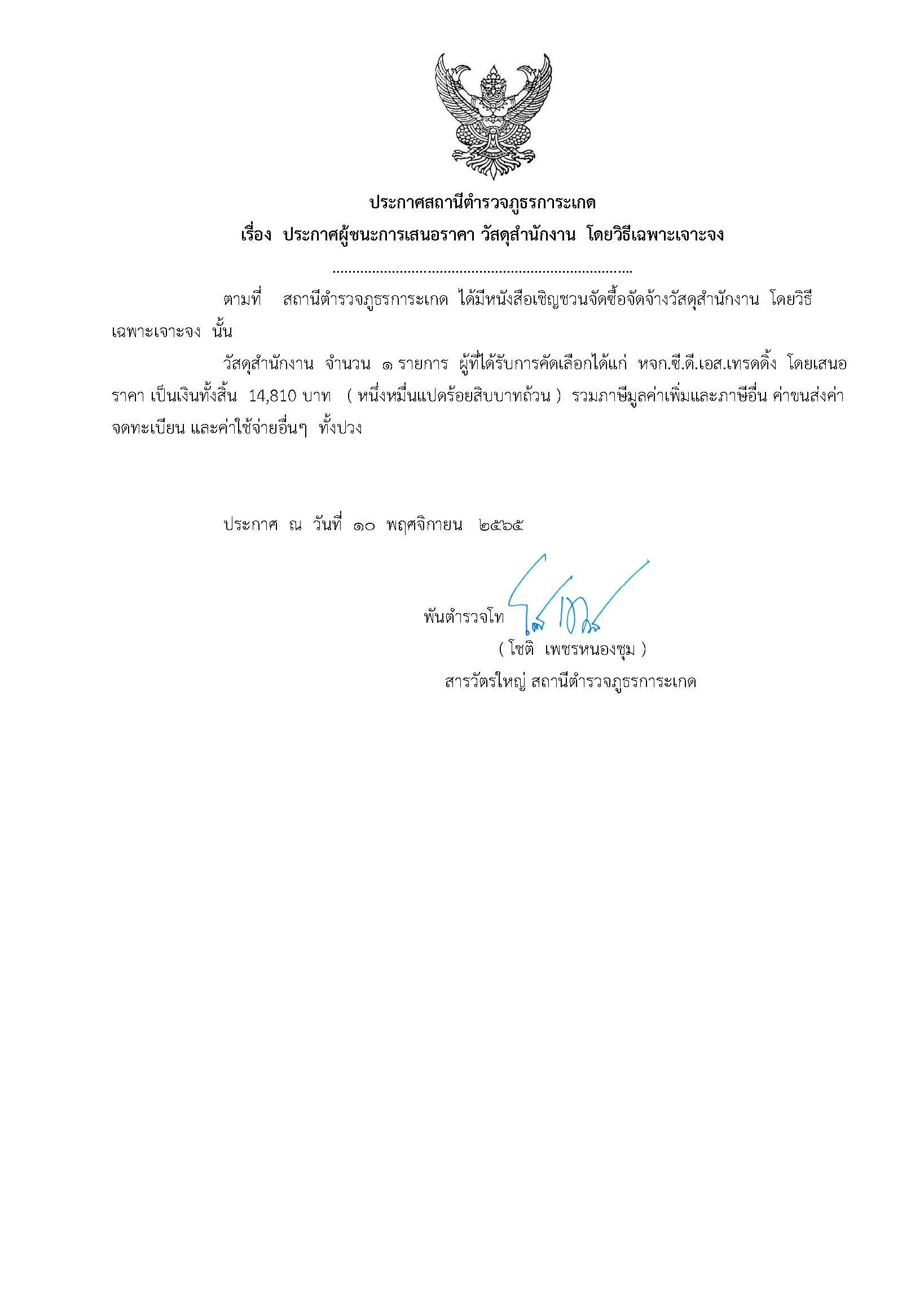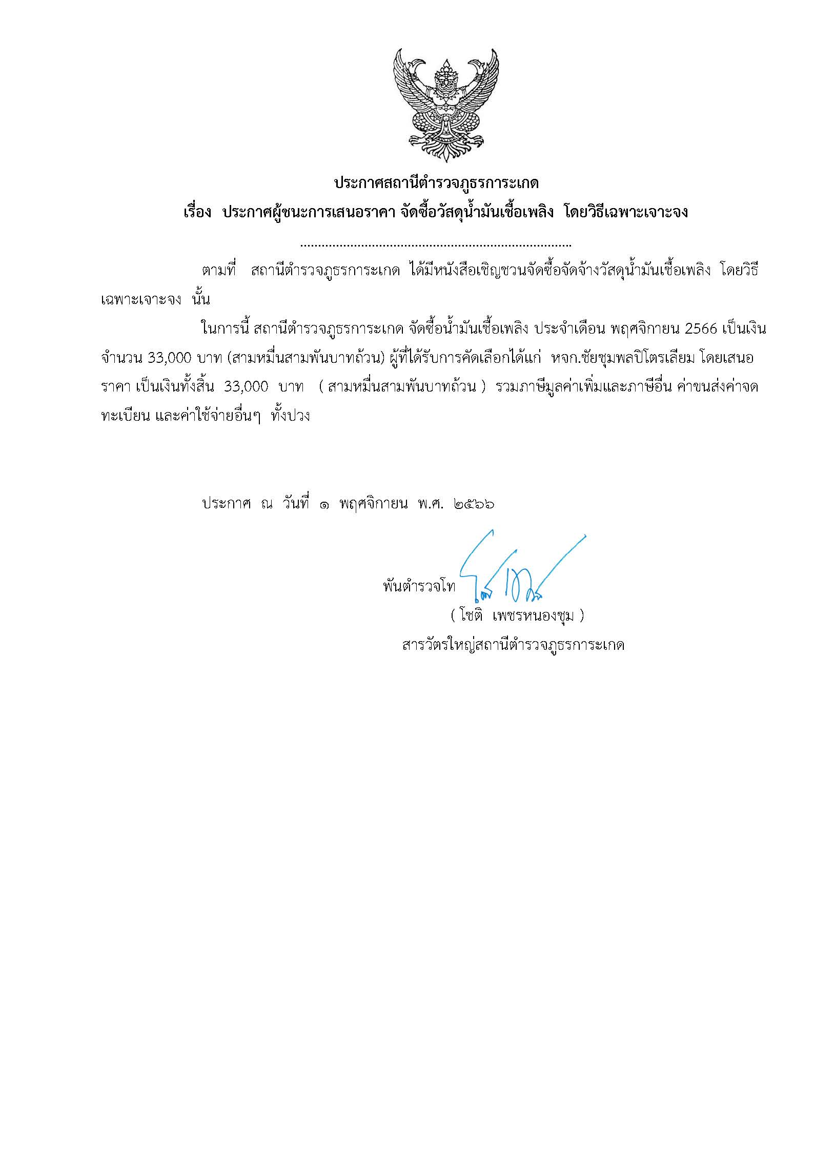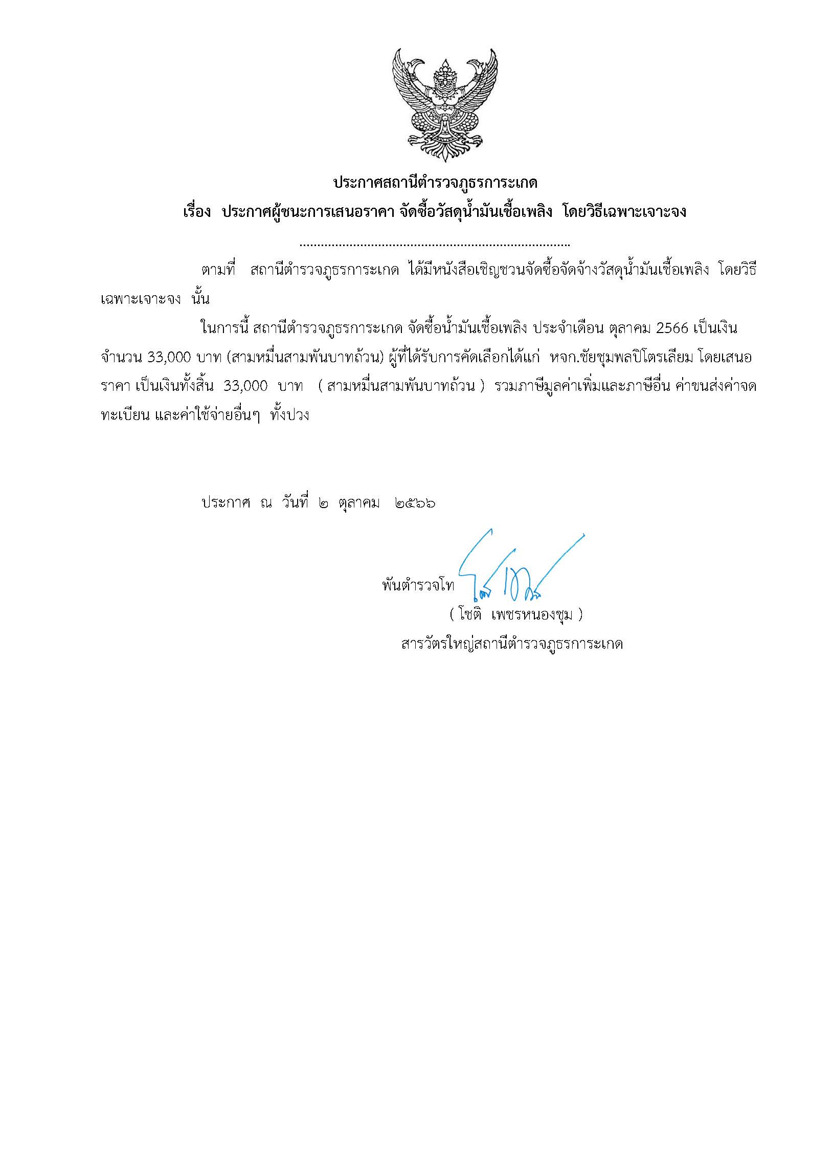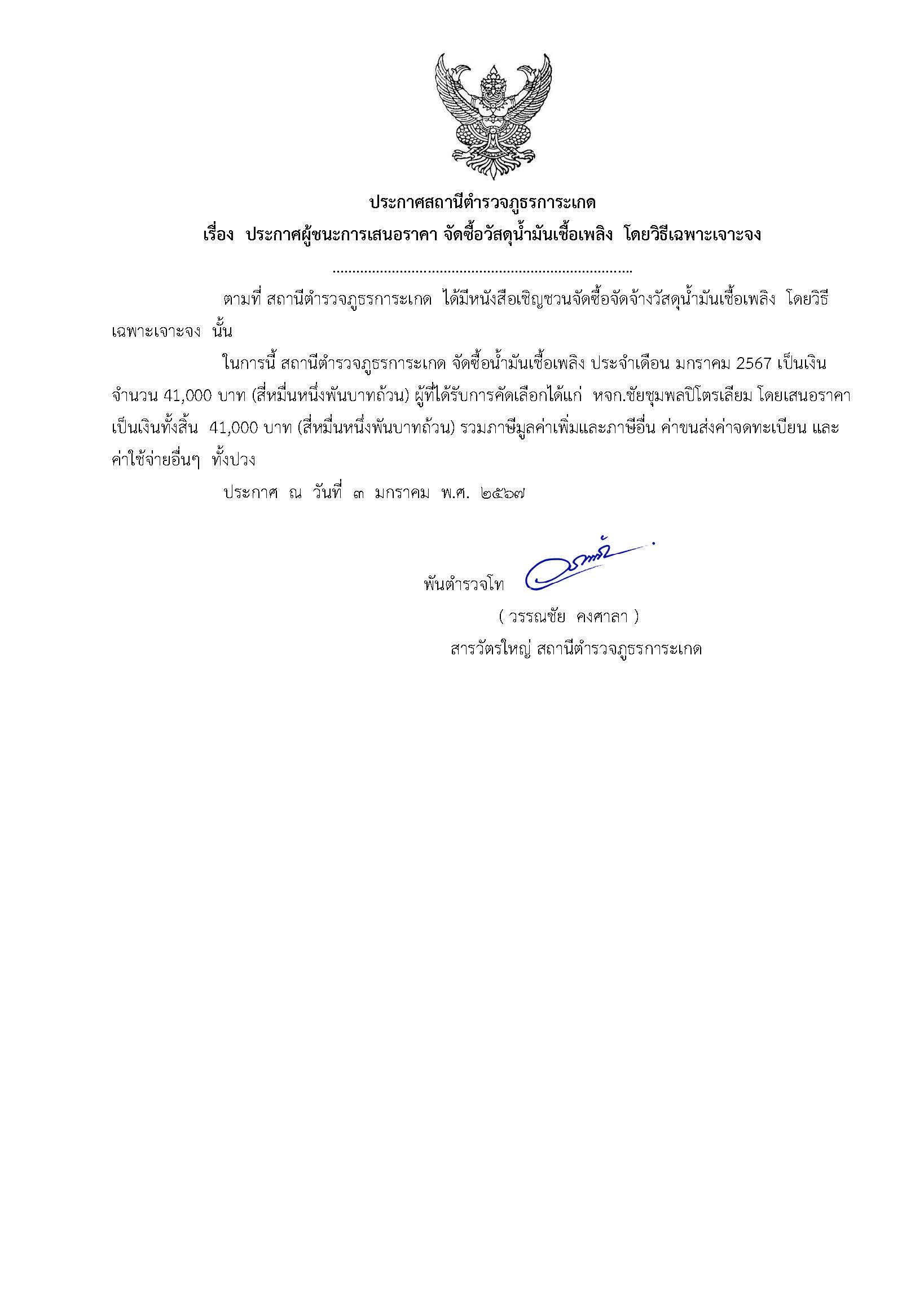 ประกาศผู้ชนะการเสนอราคา จัดซื้อวัสดุน้ำมันเชื้อเพลิง โดยวิธีเฉพาะเจาะจง