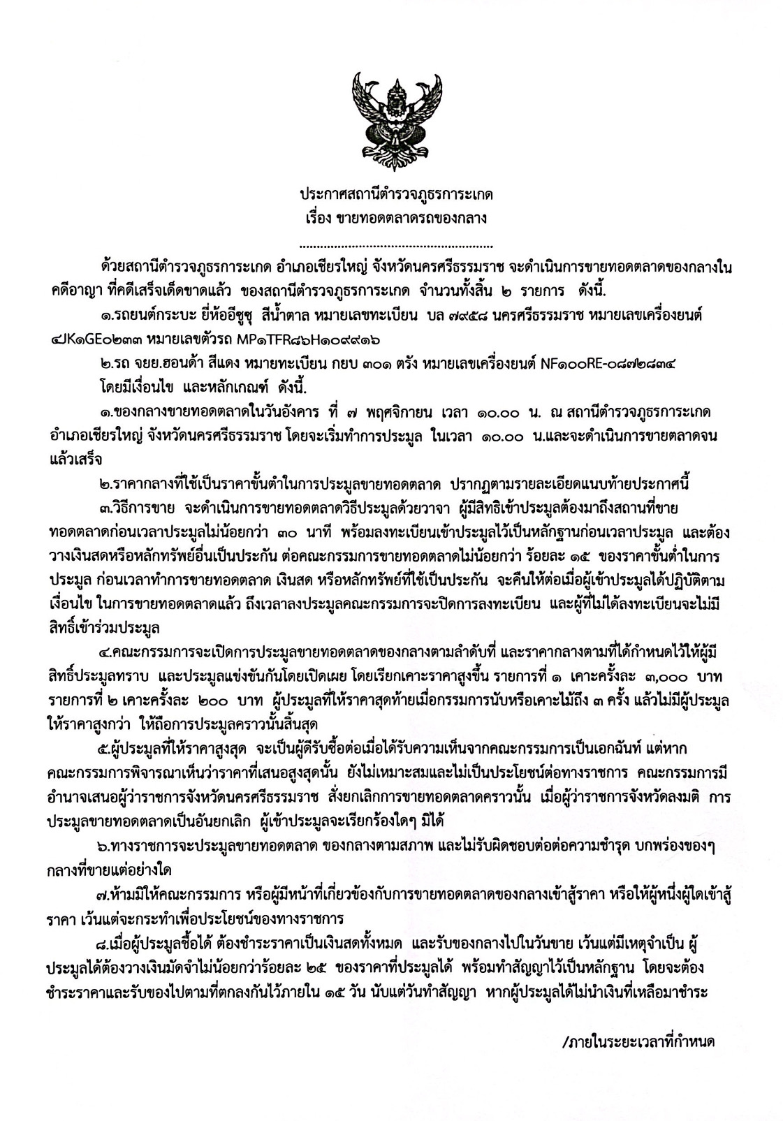 ประกาศสถานีตำรวจภูธรการะเกด เรื่อง ขายทอดตลาดรถของกลาง จำนวนทั้งสิ้น 2 รายการ 1.รถยนต์ก