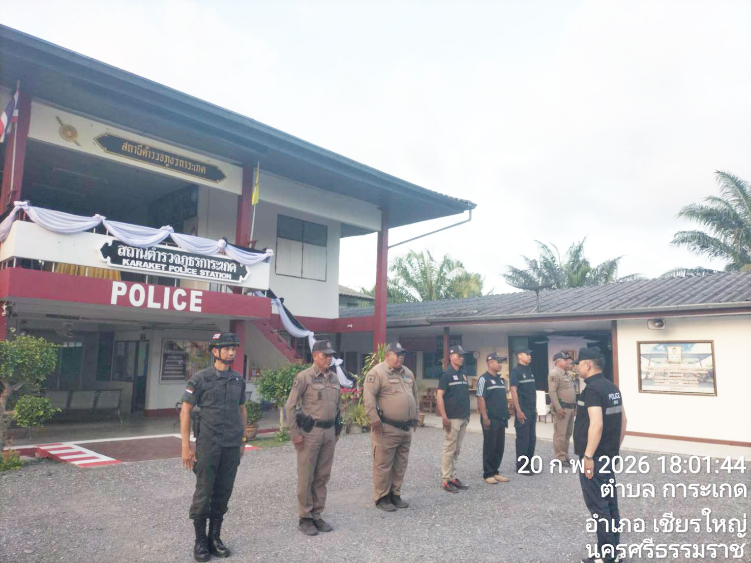 ๒ ม.ค. ๒๕๖๗ เวลา ๐๘.๐๐ น. พ.ต.ท.วรรณชัย คงศาลา สวญ.ฯ กรรมการ/กต.ตร.สภ.การะเกด พ.ต.ต.สายันต์ ชูกร สวป.สภ.การะเกด/กต.ตร.สภ.การะเกด นายทรงวุฒิ โสมจันทร์หนุน นายกเทศมนตรีตำบลการะเกด/กต.ตร.สภ.การะเกด นายสาคร โสมจันทร์ กำนันตำบลการะเกด/กต.ตร.สภ.การะเกด นางบุญจิรา คงด้วง ผอ.โรงพยาบาลส่งเสริมสุขภาพตำบลการะเกด/กต.ตร.สภ.การะเกด, กำนัน ผู้ใหญ่บ้าน ผู้นำชุมชนและจิตอาสาภาคประชาชน จำนวน ๒๐ นาย ตั้งจุดบริการเทศกาลส่งท้ายปีเก่าต้อนรับปีใหม่ ๒๕๖๗ หน้า สภ.การะเกด ม.๖ ต.การะเกด อ.เชียรใหญ่ จ.นครศรีธรรมราช