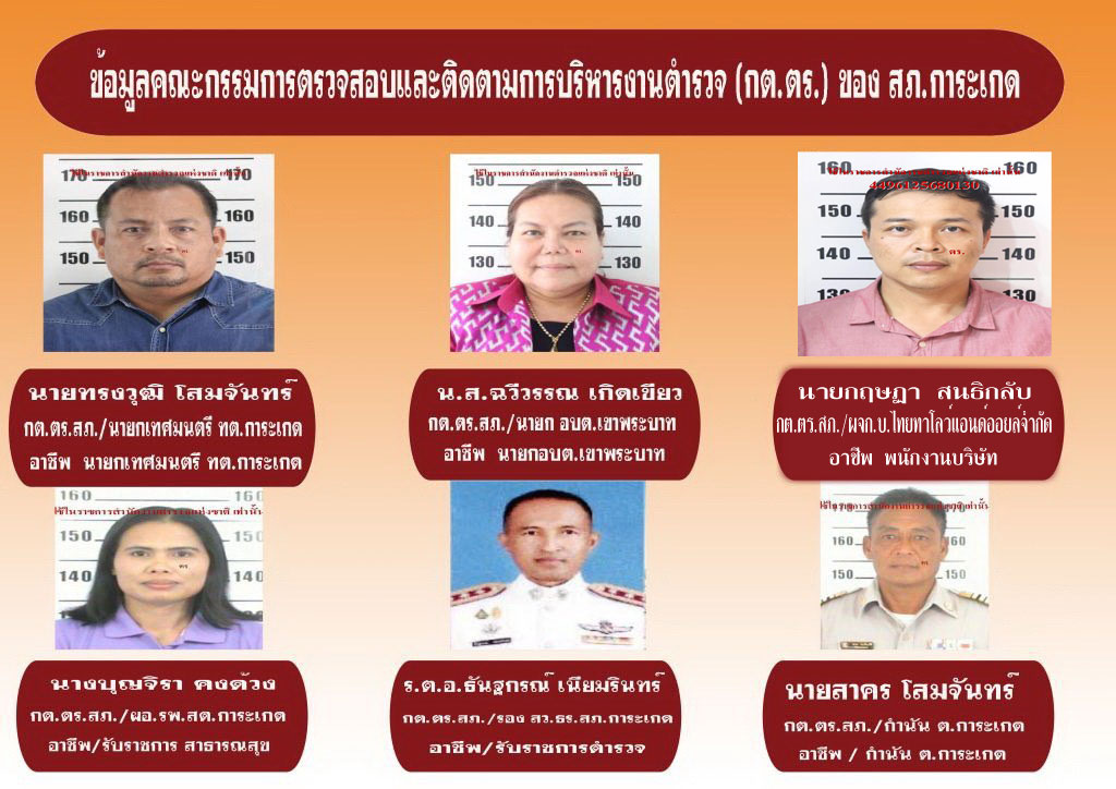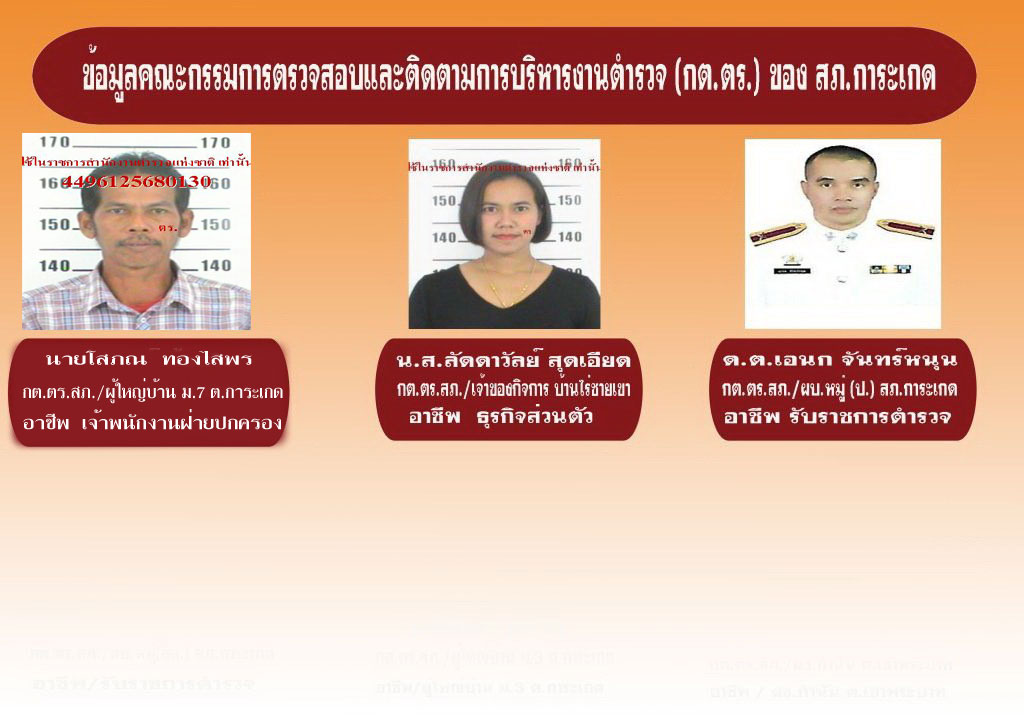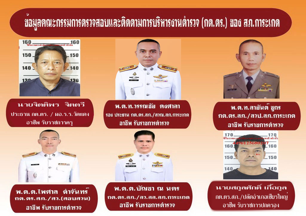 O4 ข้อมูลคณะกรรมการตรวจสอบและติดตามการบริหารงานตำรวจ(กต.ตร.)ของสถานีตำรวจ 8 มกราคม 2568 โดย admin_karaket / ไม่มีหมวดหมู่ ข้อมูลคณะกรรมการตรวจสอบและติดตามการบริหารงานตารวจ (กต.ตร.)ของสถานีตำรวจบทบาท อำหนาจหน้าที่คณะกรรมการตรวจสอบและติดตามการบริหารงานของตำรวจ(กต.ตร.) ของสถานีตำรวจรายชื่อ รูปถ่าย และอาชีพ ของคณะกรรมการตรวจสอบและติดตามการบริหารงานตำรวจ (กต.ตร.) ของสถานีตำรวจผลการดำเนินการของคณะกรรมการตรวจสอบและติดตามการบริหารงานตำรวจ(กต.ตร.) ของสถานีตำรวจ ที่ผ่านมาในรอบ 6 เดือน แรก ของปีงบประมาณ 2568( เดือน ต.ค. 67 – เดือน มี.ค. 68 ) แยกรายเดือนและเผยแพร่เป็นประจำทุกเดือน กรณี ไม่มีผลการดำเนินงานของ กต.ตร. สถานีตำรวจในรอบเดือนใด ให้ระบุว่าไม่มีผลการดำเนินงาน บทบาท คณะกรรมการตรวจสอบและติดตามการบริหารงานตำรวจ (กต.ตร.) ของสถานีตำรวจ Click here 04 บทบาท หน้าที่ กต.ตร. อำนาจหน้าที่ คณะกรรมการตรวจสอบและติดตามการบริหารงานตำรวจ (กต.ตร.) ของสถานีตำรวจ Click here O4 อำนาจหน้าที่ กต.ตร.สภ รายชื่อ /รูปถ่าย /อาชีพ /กต.ตร.สภ.การะเกด ผลการดำเนินงานของ กต.ตร. สถานีตำรวจที่ผ่านมาในรอบ 6 เดือนแรก ของปีงบประมาณ พ.ศ.2568 (ตุลาคม 2567 - มีนาคม 2568) ประจำเดือน ตุลาคม 2567 18 ตุลาคม 2567 เวลา 10.00 น. ภายใต้อำนวยการของ พ.ต.ท.วรรณชัย คงศาลา สวญ.สภ.การะเกด มอบหมายให้ ร.ต.อ.ธันฐกรณ์ เนียมรินทร์ รอง สว.อก.สภ.การะเกด เป็นหัวหน้าชุด ร.ต.อ. บุญยฤทธิ์ แก้วจำนงค์ รอง สวป.สภ.การะเกด ร.ต.อ.อนุพงศ์ แก่นแท่น รอง สวป.สภ.การะเกด สภ.การะเกด ชุด เจ้าหน้าหน้าที่ ชมส. อสม.เขาพระบาท ร่วมกับ กต.ตร.สภ.การะเกด ลงพื้นที่ เยี่ยมผู้ป่วยติดเตียง มอบ น้ำดื่มและเวชภัณฑ์ยารักษาโรค แก่ประชาชน ในพื้นที่ตำบลเขาพระ อำเภอเชียรใหญ่ จังหวัดนครศรีธรรมราช ประจำเดือน พฤศจิกายน 2567 4 พฤศจิกายน 2567 เวลา 09.00 น. พ.ต.ท.วรรณชัย คงศาลา สวญ.สภ.การะเกด พร้อมข้าราชการตำรวจ ร่วมกับ กต.ตร.สภ.การะเกด คณะครู นักเรียน ร.ร.ชุมชนวัดท่าลิพง อส.ตร.สภ.การะเกด จนท.อาสาสมัครกู้ภัยเชียรใหญ่ จัดกิจกรรม เดินรณรงค์ ตามโครงการสวมหมวกนิรภัย 100 % เพื่อลดจำนวนการบาดเจ็บรุนแรง และลดจำนวนการเสียชีวิตของผู้ขับขี่และผู้โดยสารจากการใช้รถจักรยานยนต์ ประจำเดือน ธันวาคม 2567 27 ธันวาคม 2567 เวลา 16.30 น.พ.ต.ท.วรรณชัย คงศาลา สวญ.สภ.การะเกด พร้อมด้วย ข้าราชการตำรวจชุดจิตอาสาสายตรวจจราจร สายตรวจรถยนต์ ร่วมกับ กต.ตร.สภ. ดำเนินการอบรมจิตอาสาจราจร รณรงค์การขับขี่ปลอดภัย สวมหมวกนิรภัย เพื่อลดอุบัติเหตุจราจรทางบก ในช่วงเทศกาลปีใหม่ 2568 เพื่อลดการสูญเสียชีวิตจากอุบัติเหตุของผู้ใช้รถจักรยานยนต์ นำผู้ขับขี่รถจักรยานยนต์ที่ไม่
